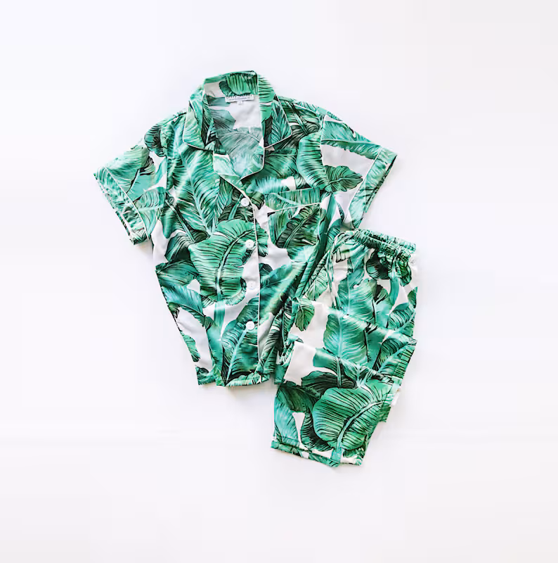 Monogram Pajama Set Green Palm Leaf Satin Blend